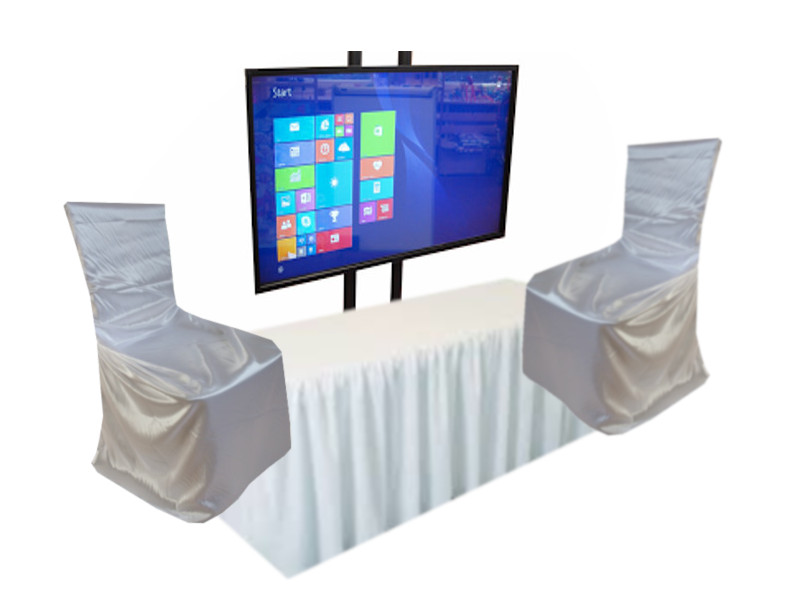 Nabízíme pronájem prezentační sestavy na svatby, veletrhy, výstavy. Dotyková sestava včetně stolu, židlí a dekorace (ubrus, rautová sukně, potahy na židle).